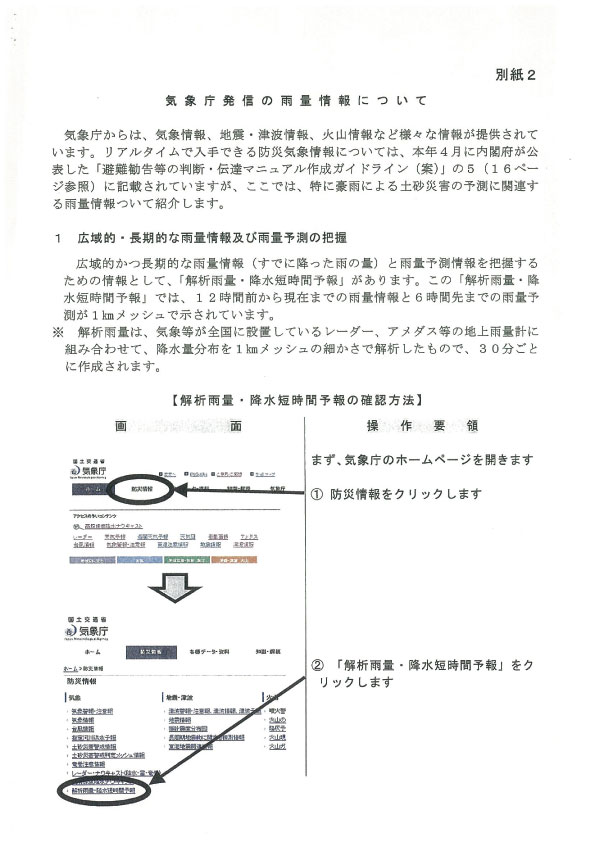 近年全国各地で想定を超える雨量が局地的に降り大きな災害となる場合が増えています。そうした中、気象庁、国土交通省ではリアルタイムで入手できる防災気象情報があります。詳しくは下記の書類をダウンロードしてスマホ等で情報収集をして安心・安全な消防・防災活動を行ってください。