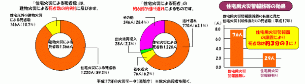 アメリカやイギリスでは日本に先立ち、住宅用火災警報器の設置が義務付けられており住宅火災における死者の低減 に効果をあげています。日本においても住宅用火災警報器の 設置の有無で死者数が大きく変わっているのが現状です。